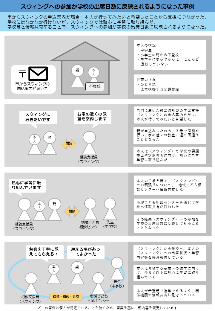 スウィングへの参加が学校の出席日数に反映されるようになった事例 2024.3.15 スウィングへの参加が学校の出席日数に反映されるようになった事例 関わった機関はこちら岡山市子どもの学習サポート事業(通所型)
