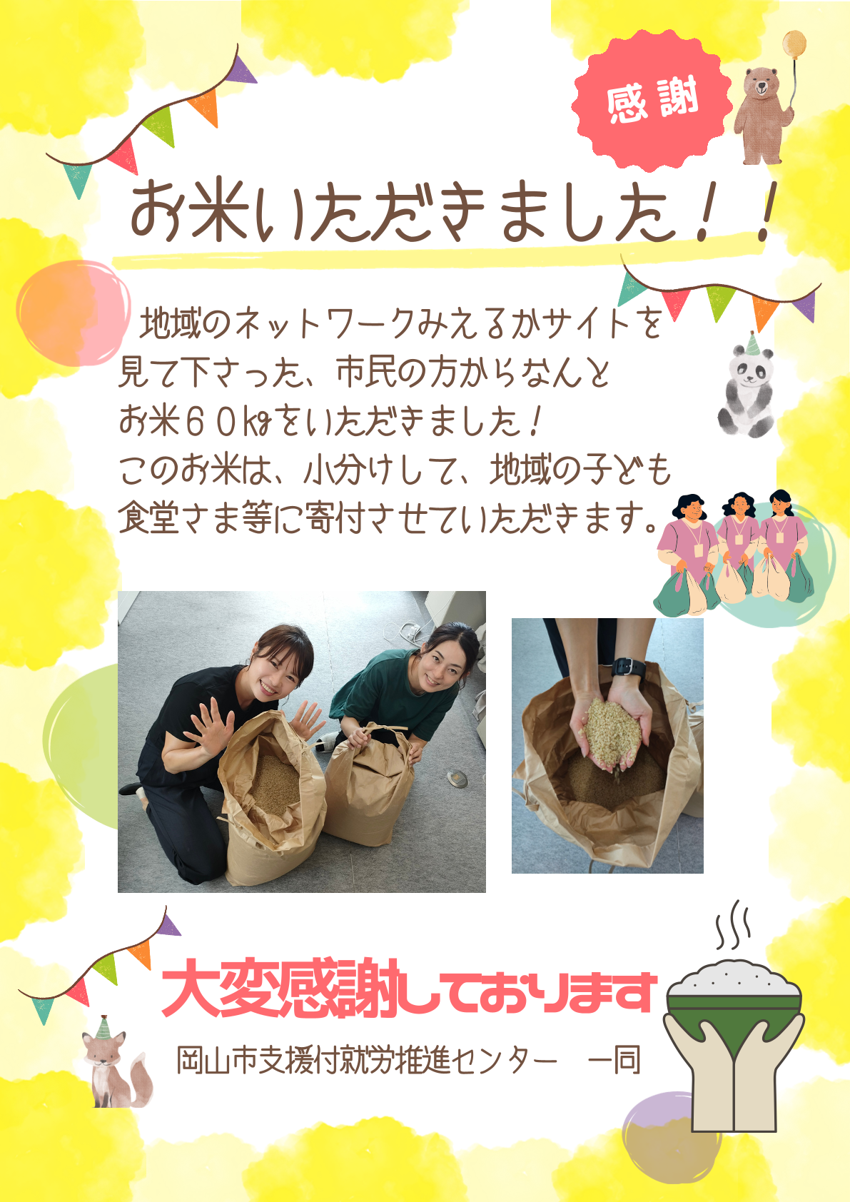 感謝|岡山市支援付就労推進事業は、さまざまなお悩みを抱え、働くことが難しい方向けに定期的なカウンセリングや就労体験・ボランティアへ参加する機会を提供しながら一般就労へ向けた支援を行っています。