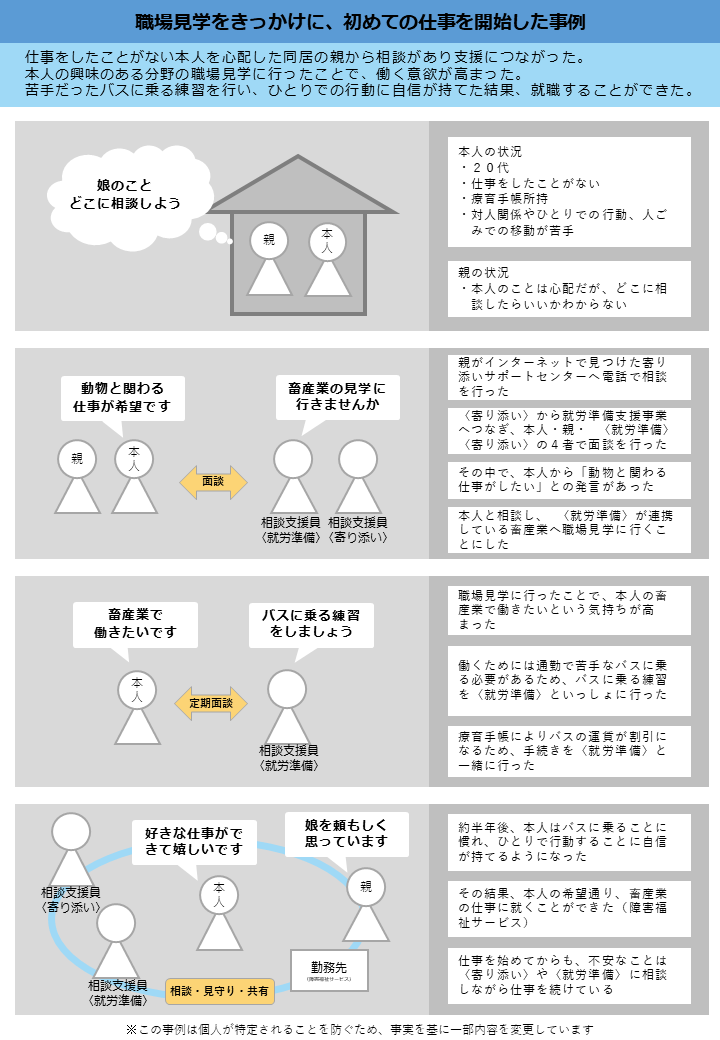 職場見学をきっかけに、初めての仕事を開始した事例 2024.3.15 職場見学をきっかけに、初めての仕事を開始した事例 関わった機関はこちら岡山市寄り添いサポートセンター岡山市就労準備支援事業『岡山市就労準備支援センター』