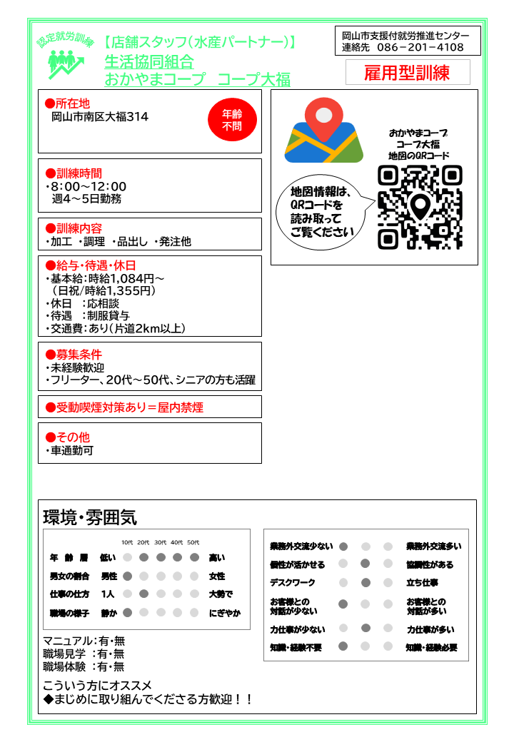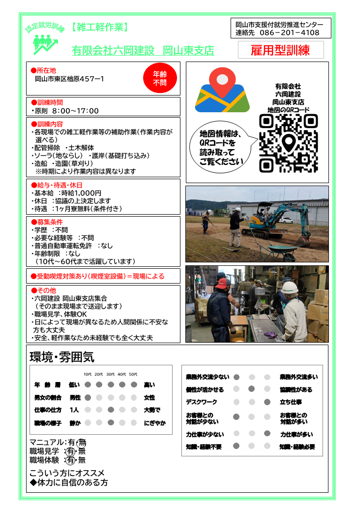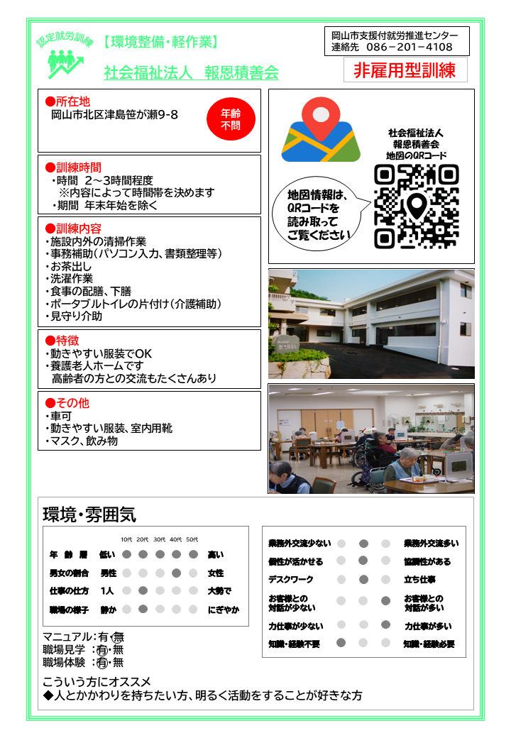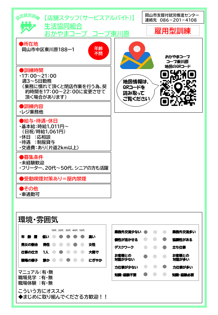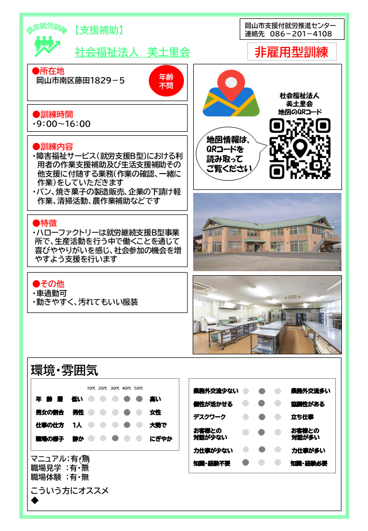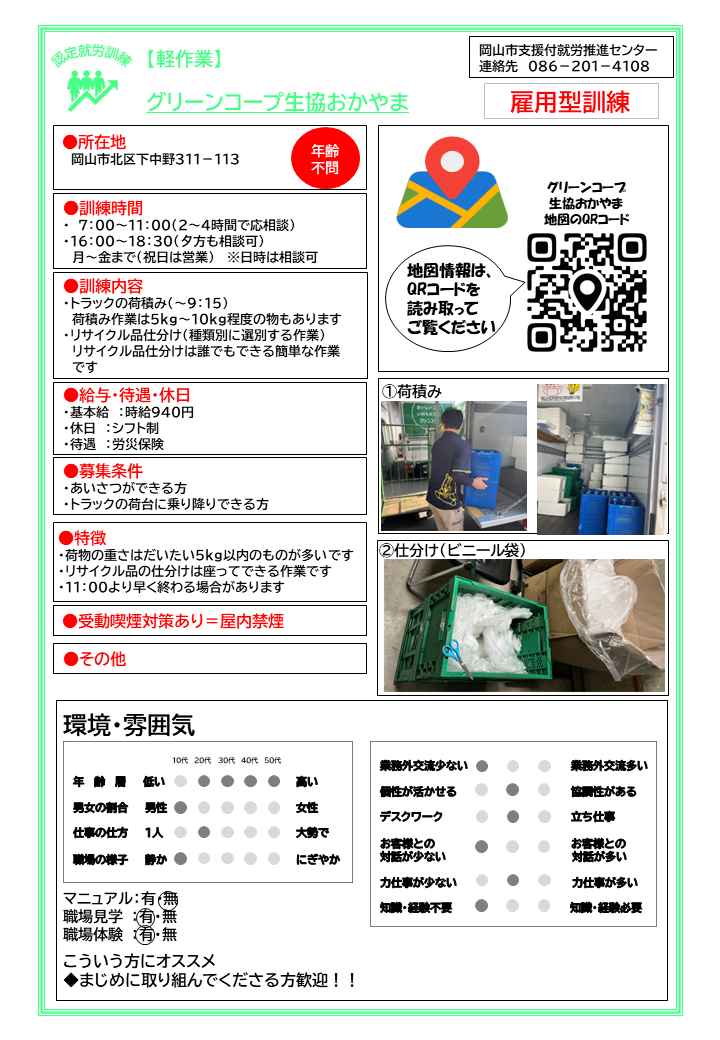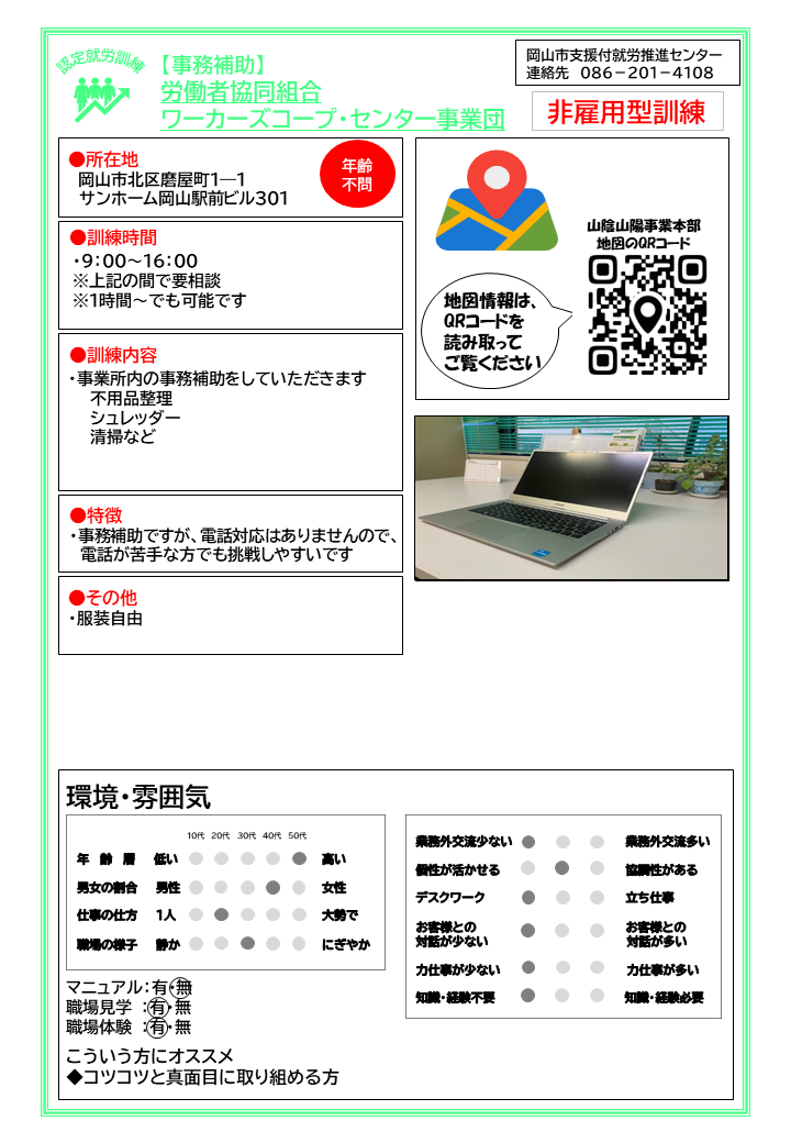 認定就労訓練事業所一覧|岡山市支援付就労推進事業 | 岡山市支援付就労推進センター 岡山市支援付就労推進事業は、さまざまなお悩みを抱え、働くことが難しい方向けに定期的なカウンセリングや就労体験・ボランティアへ参加する機会を提供しながら一般就労へ向けた支援を行っています。
