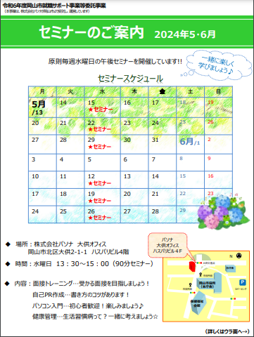 岡山市就職サポート事業様より、5月~6月のセミナーのお知らせです。