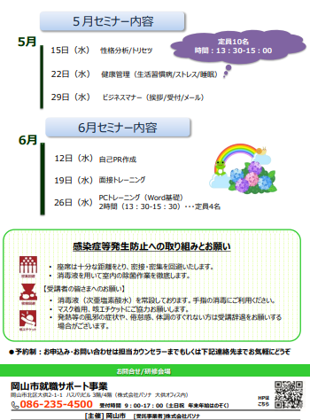 岡山市就職サポート事業様より、5月~6月のセミナーのご案内です。